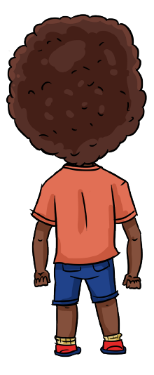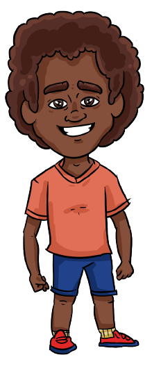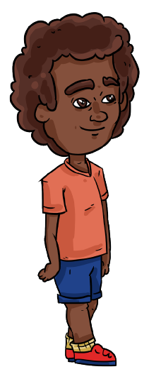 Criança afrodescendente, cabelo black, 8 anos de idade. João é filho de Fernanda e Ariel e irmão de Mariana.