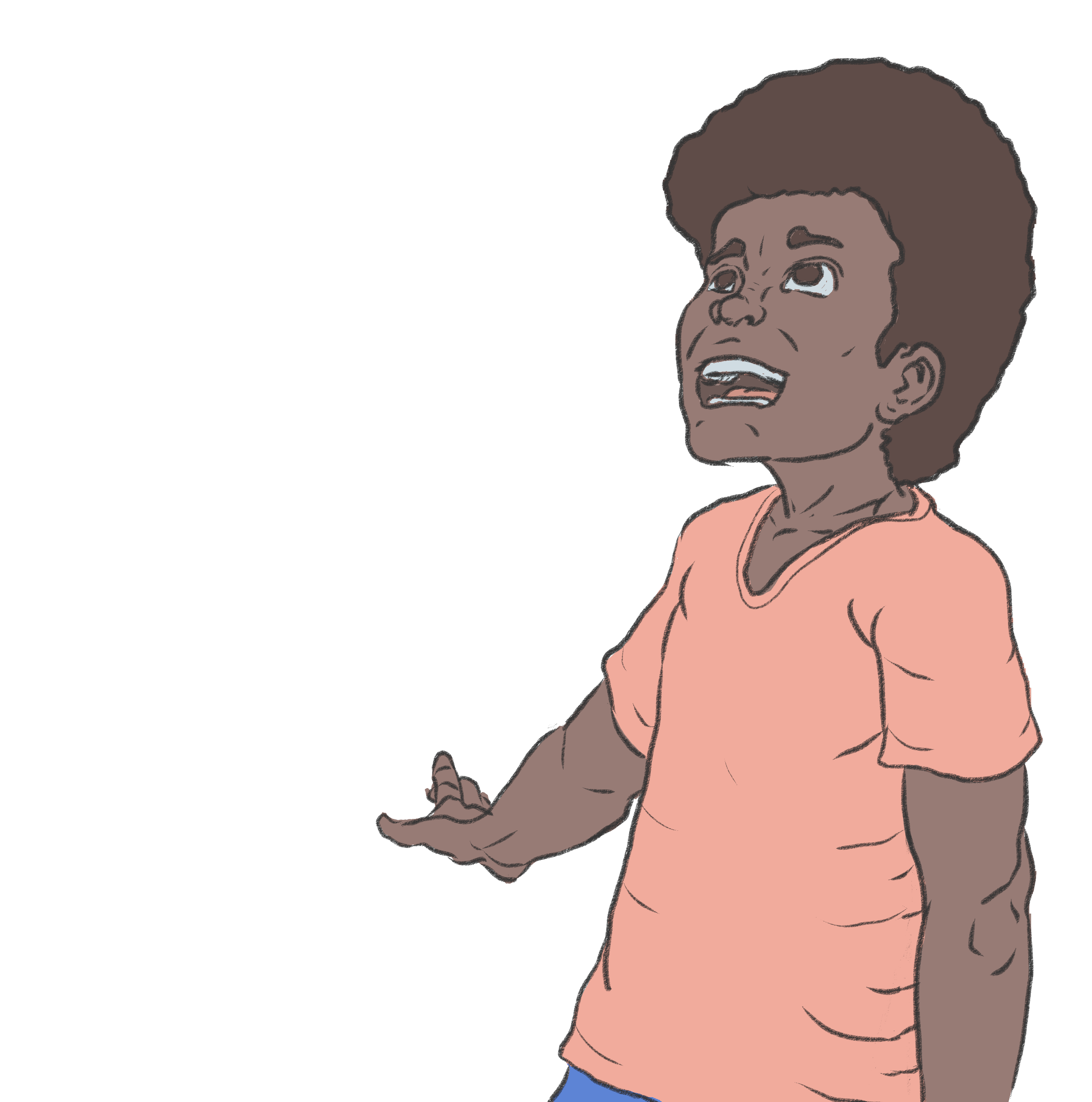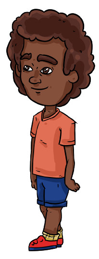 Criança afrodescendente, cabelo black, 8 anos de idade. João é filho de Fernanda e Ariel e irmão de Mariana.